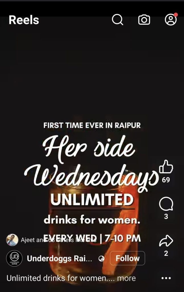 छत्तीसगढ़ की राजधानी रायपुर, जो अपनी समृद्ध परंपराओं और शालीनता के लिए जानी जाती है, आज एक नए ‘पश्चिमी नशे’ की गिरफ्त में है। हाल ही में शहर के प्रमुख क्लब ‘Underdoggs’ द्वारा सोशल मीडिया पर साझा किया गया एक विज्ञापन चर्चा और विवाद का विषय बन गया है। इस विज्ञापन में “Her side Wednesdays” के नाम पर महिलाओं को हर बुधवार शाम 7 से 10 बजे तक ‘अनलिमिटेड ड्रिंक्स’ (Unlimited Drinks) परोसने का लालच दिया जा रहा है।